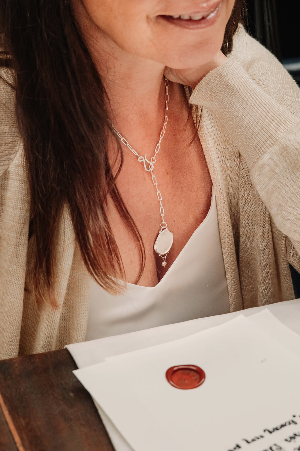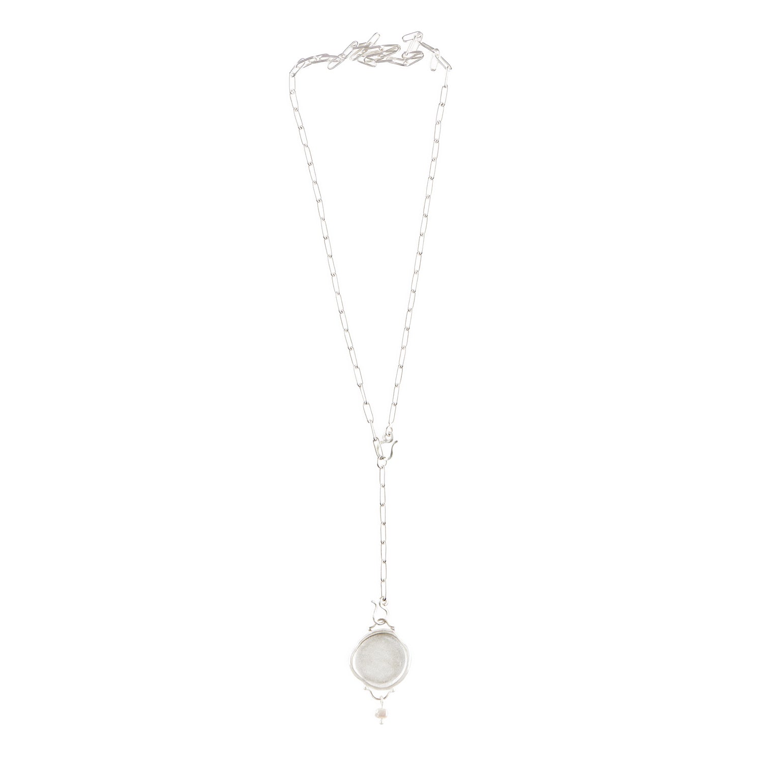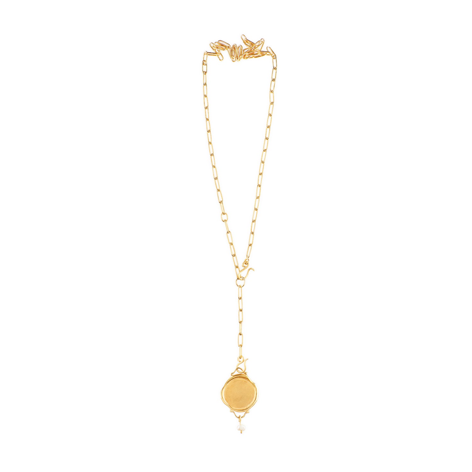 Long chain necklace with a wax seal-shaped medal and a 4mm baroque pearl.