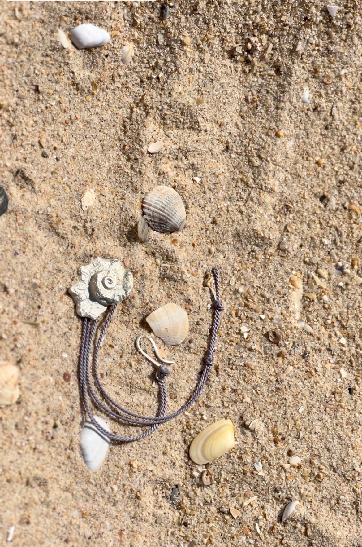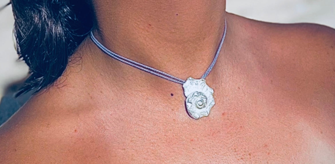 Large cowrie shell pendant with colorful silk cord and silver clasp.