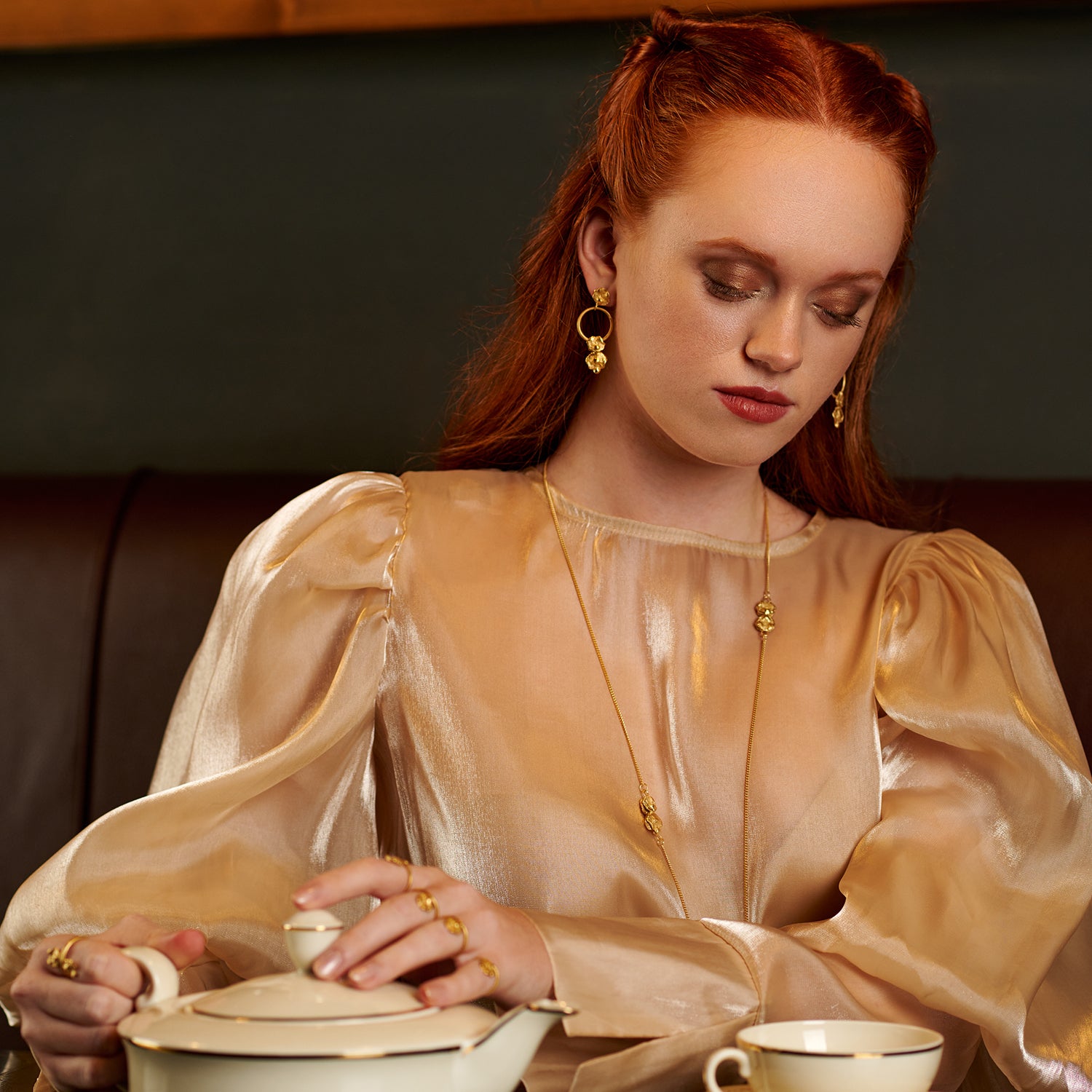 Extra-long pendant with 3 floral elements scattered along the chain.